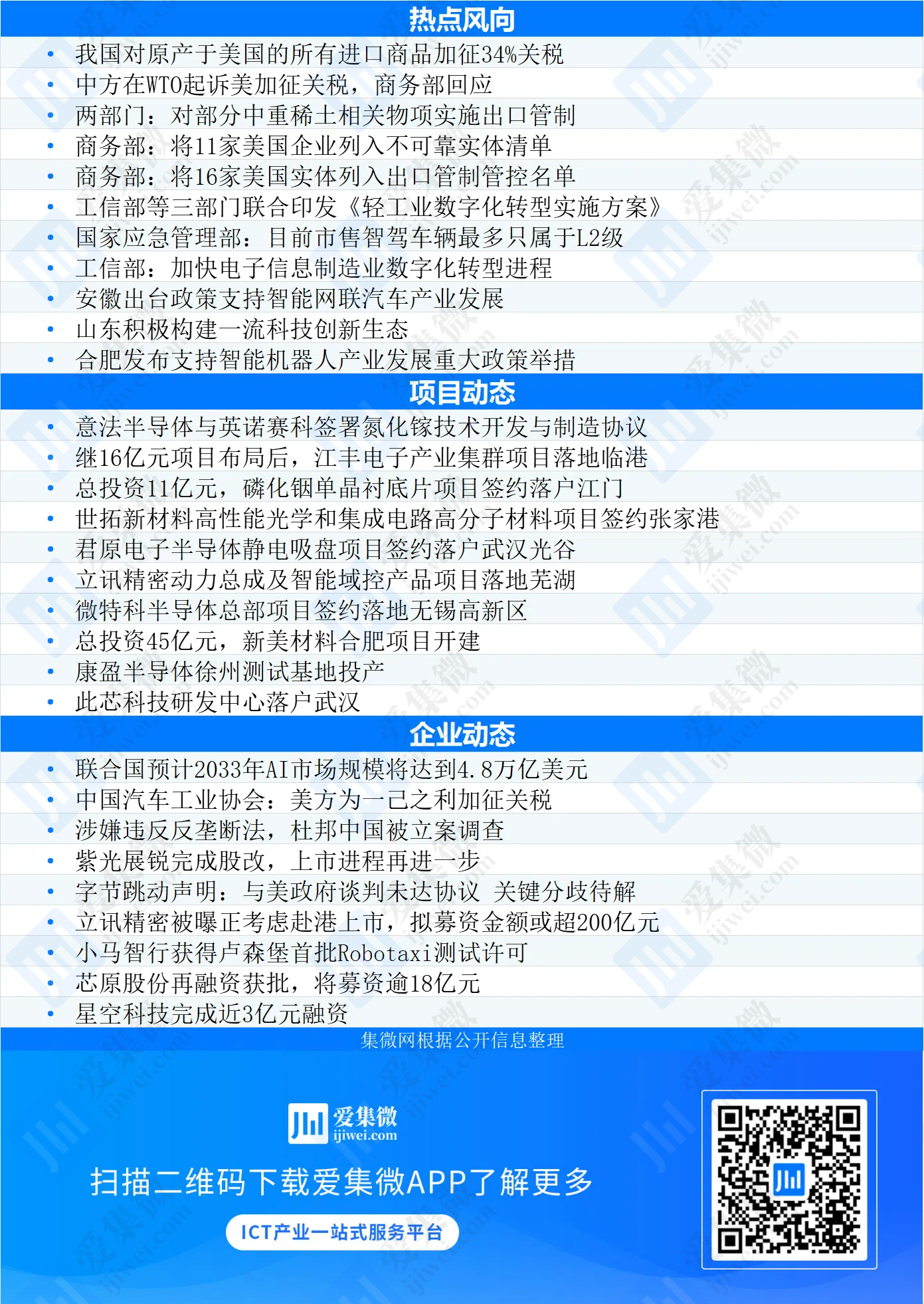 本周以来,我国对原产于美国的所有进口商品加征34%关税;中朴直在WTO告状美加征关税;商务部:将11家美国企业列入不靠得住实体清单;应急办理部:目前市售智驾车辆最多只属于L2级;意法半导体取英诺赛科签订氮化镓手艺开辟取制制和谈;江丰电子财产集群项目落地临港;涉嫌违反反垄断法,杜邦中国被立案查询拜访……
