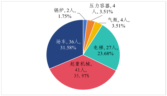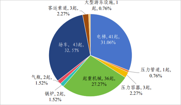 截至2024年岁尾,县级以上市场监管部分共设立特种设备平安监察机构3235个。此中,国度级1个,市级492个,县级2613个,区县派出机构97个。全国特种设备平安监察人员共计127505人。截至2024年岁尾,全国共有特种设备查验检测机构5328家,持证5609个。此中,特种设备分析性查验机构620个,型式试验机构42个,气瓶等其他查验机构2577个,无损检测机构895个,平安阀校验机构1365个,电梯检测机构110个。特种设备分析性查验机构,包罗市场监管系统内查验机构263个、社会查验机构和企业自检机构355个、手艺查抄机构2个。2024年,全国共演讲特种设备及其相关变乱、事务(以下统称变乱)132起,灭亡114人。全年未发生沉特大变乱,特种设备平安形势总体平稳。2024年加强了舆情监测取核查,扩大了统计口径,将特种设备相关平安事务也纳入统计范畴。按设备类别划分,汽锅变乱2起,灭亡2人;压力容器变乱3起,灭亡4人;气瓶变乱2起,灭亡4人;电梯变乱41起,灭亡27人;起沉机械变乱36起,灭亡41人;场车变乱43起,灭亡36人;压力管道变乱1起,客运索道变乱3起,大型逛乐设备变乱1起,均未制员灭亡。(见图3、图4)此中,场车、电梯和起沉机械变乱占比力大,占变乱总起数的90。90%、灭亡总人数的91。23%。
