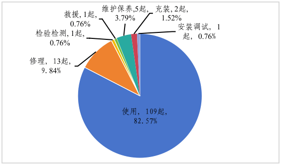 按发生环节划分,发生正在利用环节109起,占82。57%;补缀环节13起,占9。84%;调养环节5起,占3。79%;充拆环节2起,占1。52%;安拆调试环节1起,占0。76%;查验检测环节1起,占0。76%;救援环节1起,占0。76%(见图5)。