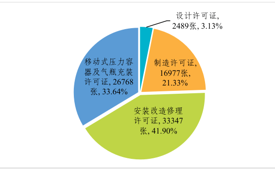 截至2024年岁尾,全国共有特种设备出产(含设想、安拆、补缀)和充拆单元76450家,持有许可证79581张,此中:设想许可证2489张,制制许可证16977张,安拆补缀许可证33347张,挪动式压力容器及气瓶充拆许可证26768张(见图2)。